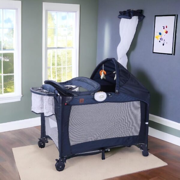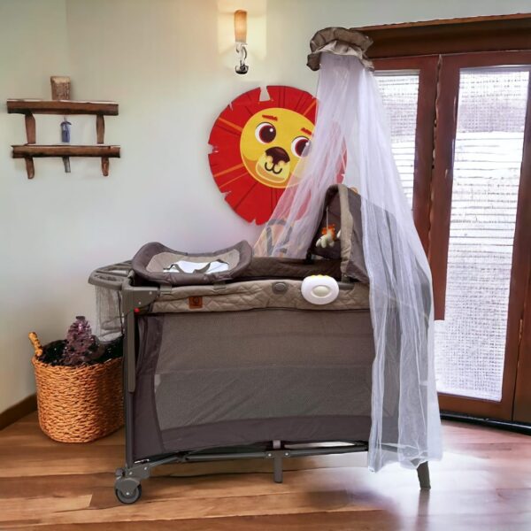 Una cuna corral con cambiador, organizador, colecho y toldillo alto es una solución multifuncional para el cuidado del bebé. El diseño generalmente incluye: