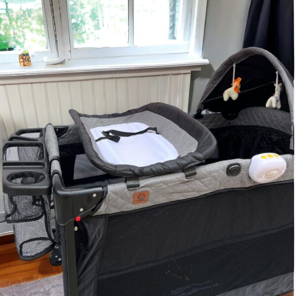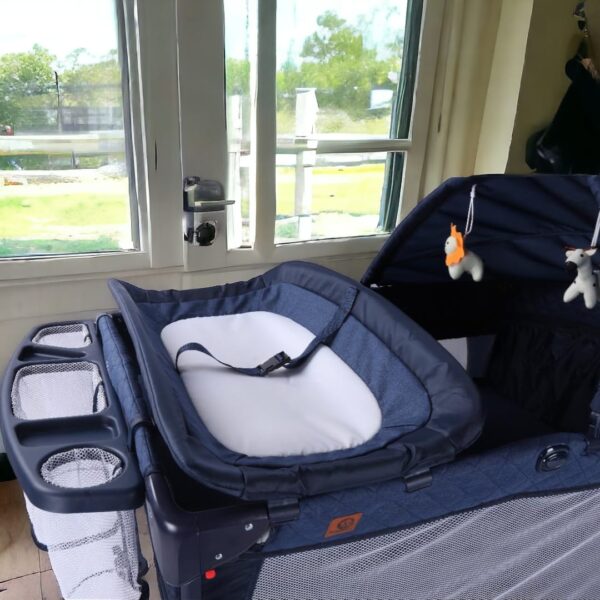El organizador está incorporado a un lado o al pie del corral, y cuenta con varios compartimentos para guardar pañales, toallitas, ropa y otros elementos esenciales para el cuidado del bebé, manteniéndolos a mano y organizados.